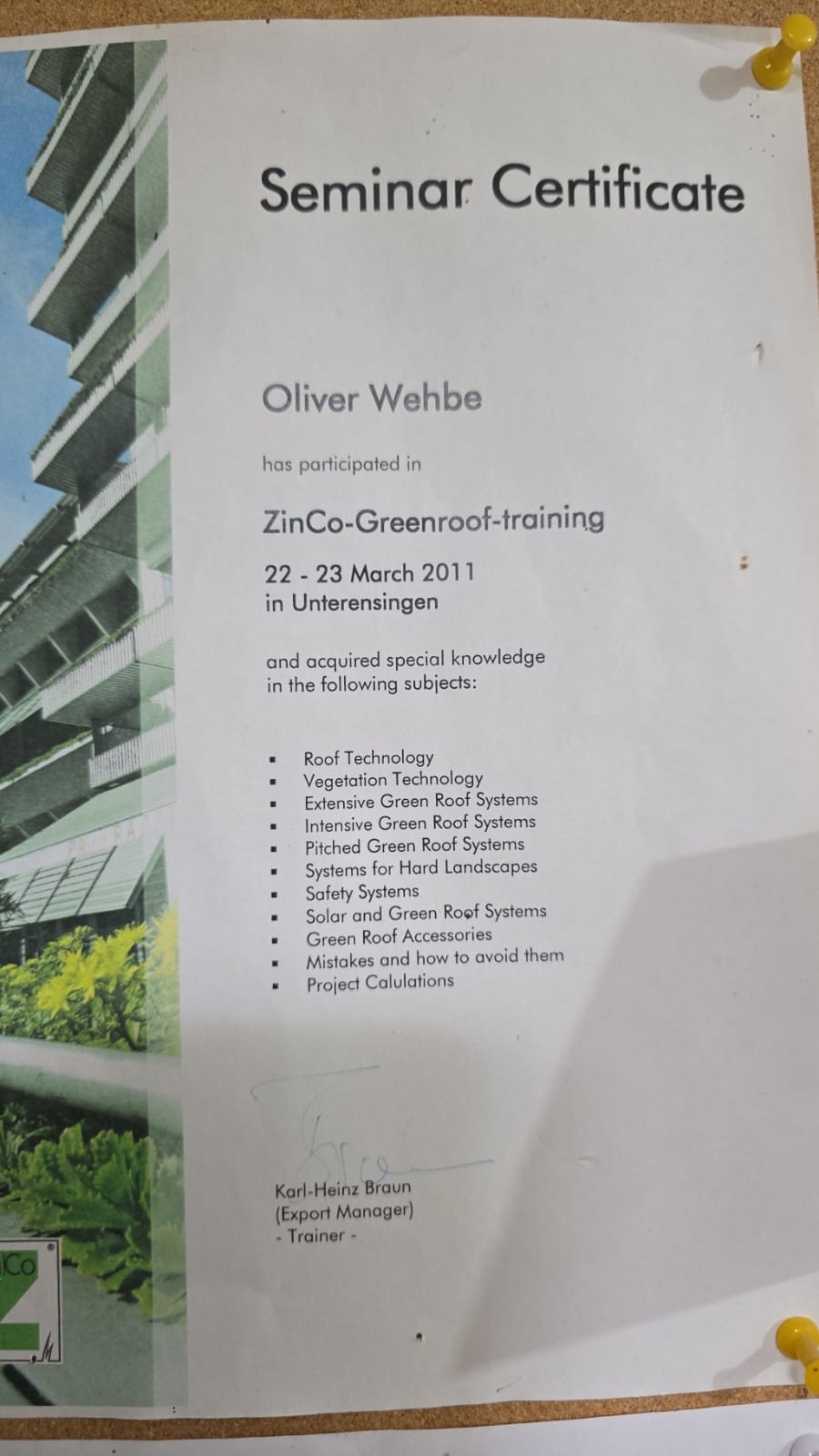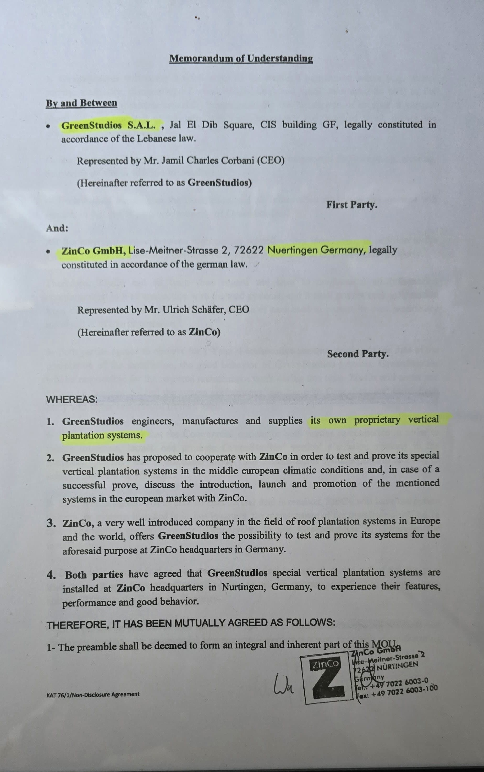 MOU WITH ZINCO GERMANY TO ADOPT OUR PATENTED GREEN WALL TECHNOLOGY FOR ZINCO - 2014