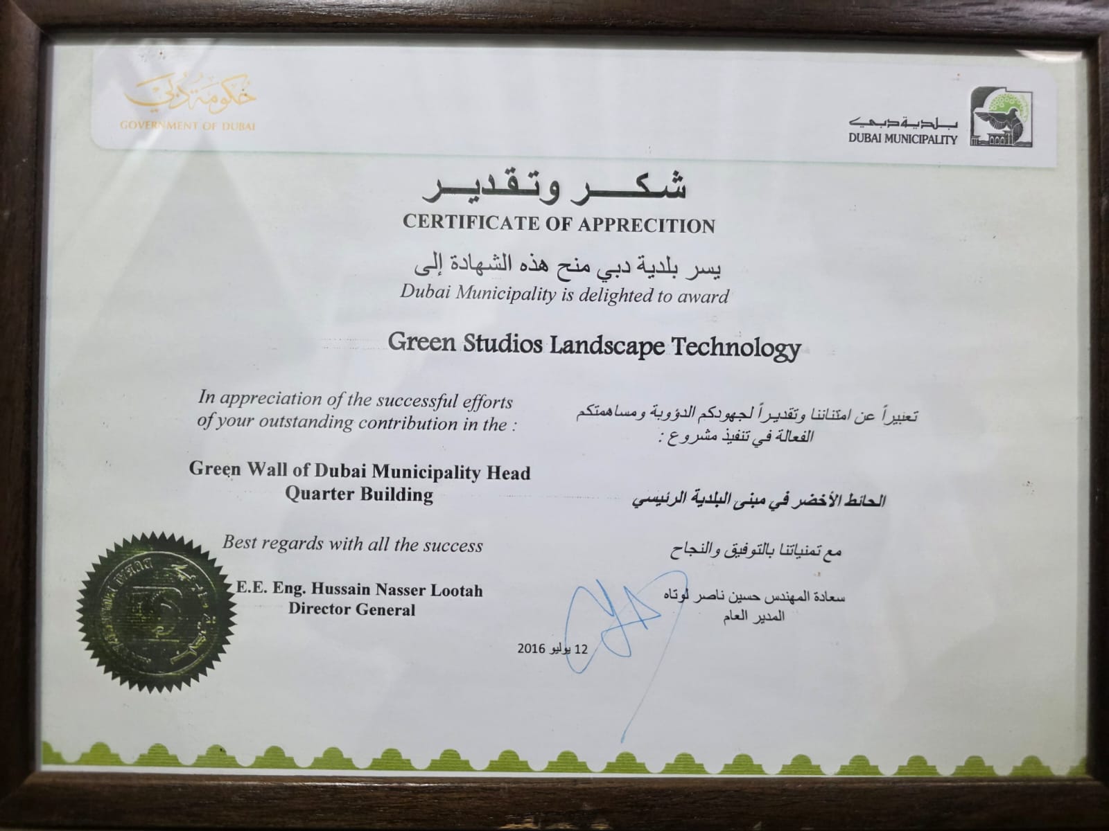 CERTIFICATE OF APPRECIATION FROM THE DUBAI MUNICIPALITY - 2016